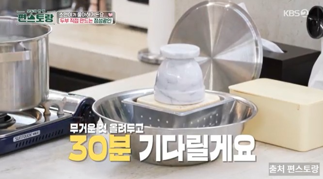 12. 누르개 위에 무거운 물건을 올려 30분 이상 물을 빼줍니다.