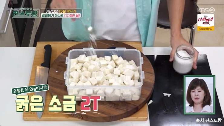 2. 김치통에 깍뚝썰기한 무, 굵은소금 2T를 넣고 뚜껑을 닫아 흔든 뒤, 1시간 동안 절인 뒤 물을 뺍니다.