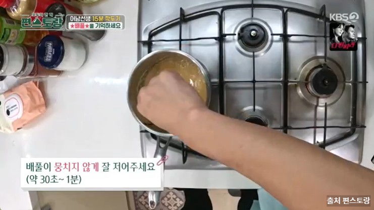 4. 밀가루가 섞이면 불을 켜 저어가며 강불로 끓입니다.