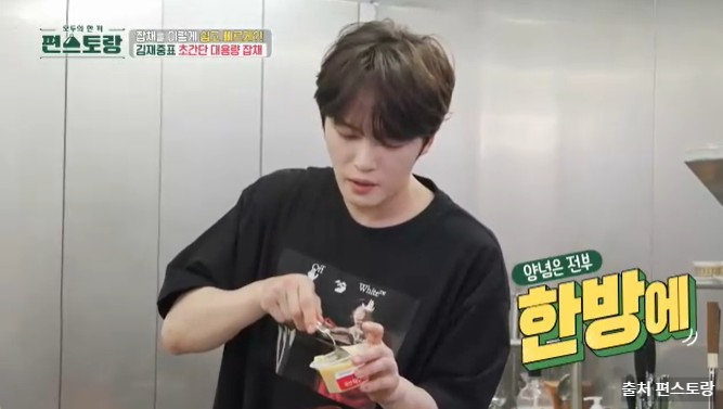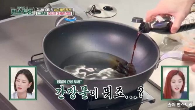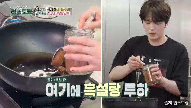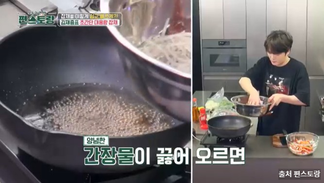 간장물 끓여 면과 야채, 양념까지 한 팬에서 끝내는 김재중 잡채! 배테랑 주부처럼 계량 없이 휙휙 요리하시는 게 인상 깊더라고요. 간단하게 원팬으로 대용량으로 만드신 후 한 번 먹을 양씩 소분해서 보관하시면 언제든지 간편하게 드실 수 있습니다.