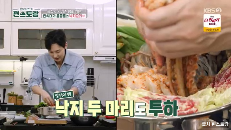 각종 채소와 함께 낙지, 고기를 한번에 즐길 수 있는 윤종훈 갈낙샤부샤부전골과 한입 쌈밥! 손님 상차림으로 딱인 메뉴네요! 기력이 없을 때 몸보신 메뉴로도 완벽한 갈낙샤부샤부전골! 따끈한 국물이 생각나실 때 한번 도전해보세요.