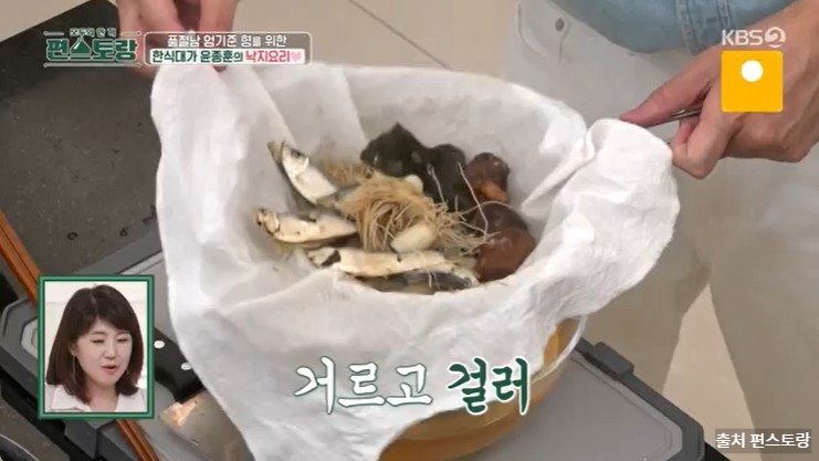 7. 다 끓은 육수는 면포에 걸러 준비합니다.