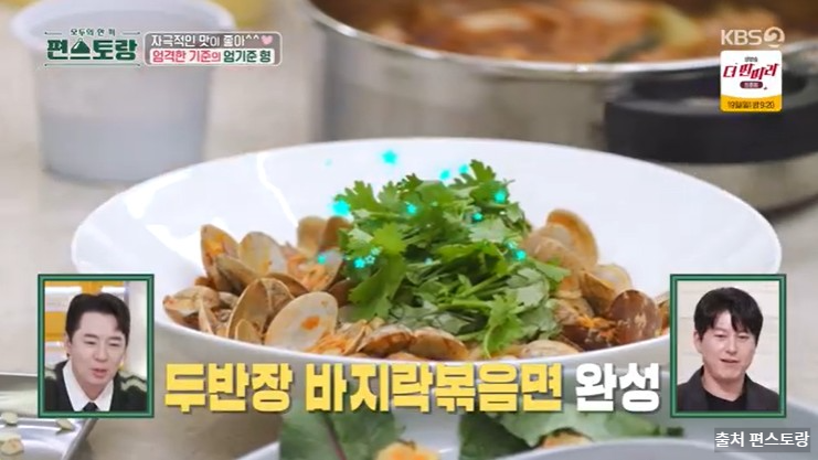 앞선 메뉴들은 본인 입맛에 다 슴슴하다고 엄격한 기준을 앞세우시던 엄기준 배우님도 두반장 바지락 볶음면은 너무 맛있다고 극찬하셨는데요, 칼칼한 맑은 바지락탕과 두반장 바지락 볶음면! 두 메뉴 전부 너무 맛있어 보이네요~