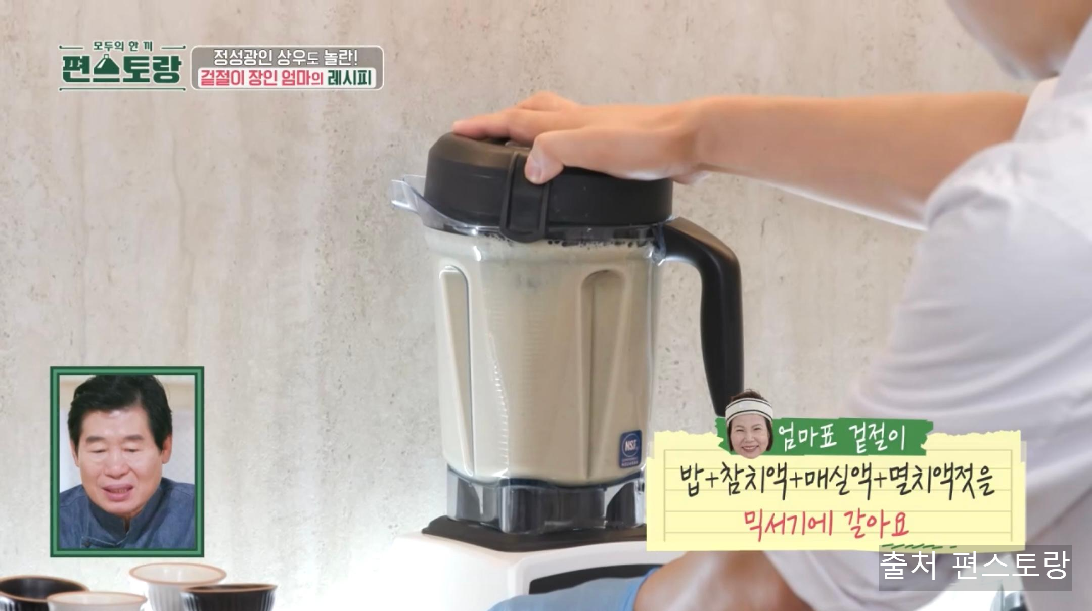 4. 밥 1공기, 참치액 1컵, 매실 1컵, 멸치액젓 1/2컵을 믹서에 넣고 갈아준다.