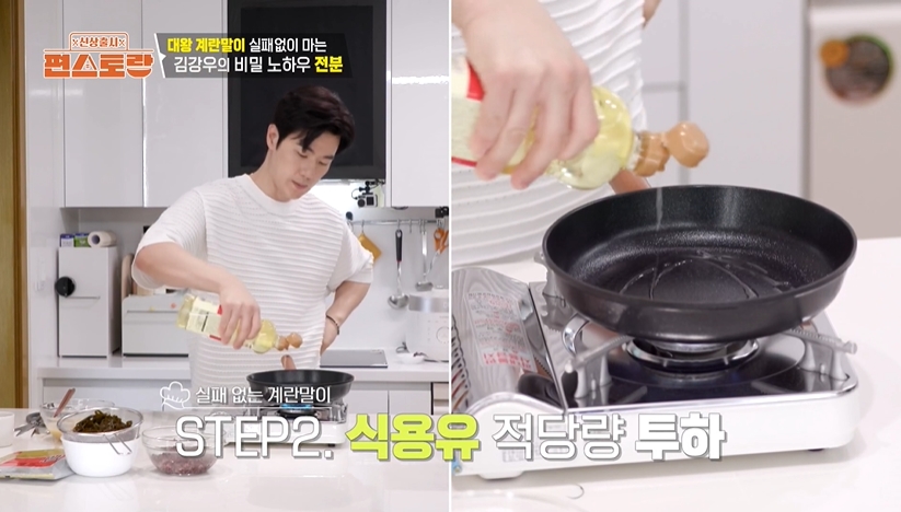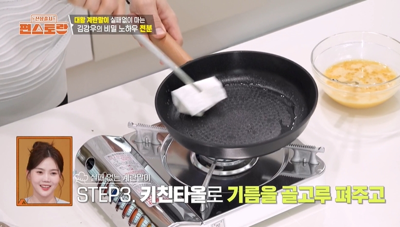 3. 중불로 예열된 팬에 식용유를 두르고 키친타올로 닦아낸 뒤, 2의 계란물 절반을 부어 익힙니다.