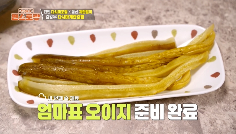 2. 다시마조림 → 계란말이 → 오이지를 순서대로 넣고 돌돌 말아주세요.