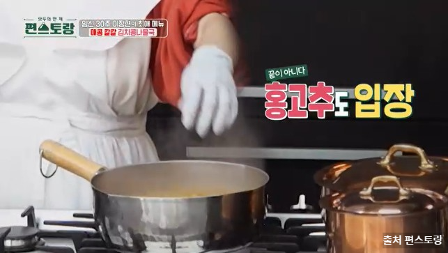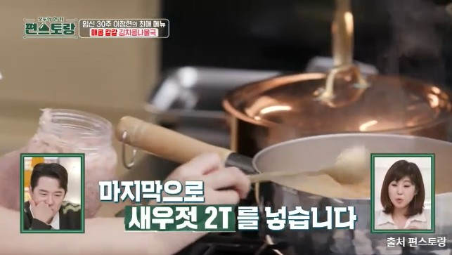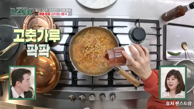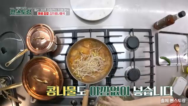 임신 막달이라 칼칼한 게 당기시는 것인지 요즘 계속 콩나물국을 드시고 계시다는 이정현님. 저희 집에서는 감기에 걸렸을 때 이 김치콩나물국을 먹어서 그런지 저도 콩나물국 하면 제일 먼저 김치콩나물국이 생각나요.