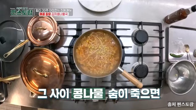 임신 막달이라 칼칼한 게 당기시는 것인지 요즘 계속 콩나물국을 드시고 계시다는 이정현님. 저희 집에서는 감기에 걸렸을 때 이 김치콩나물국을 먹어서 그런지 저도 콩나물국 하면 제일 먼저 김치콩나물국이 생각나요.