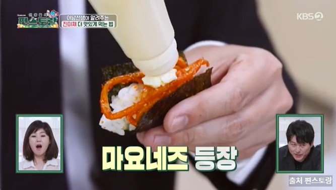 1. 김 또는 깻잎에 싸서 마요네즈를 얹어 먹는다.