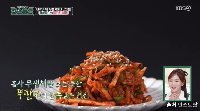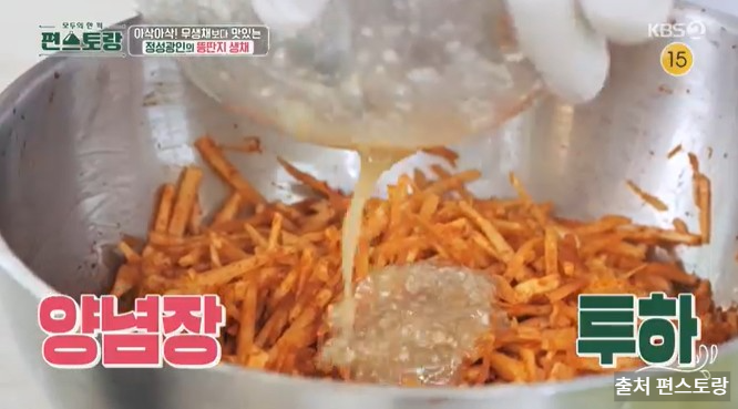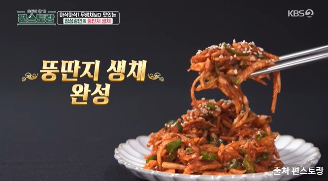 뚱딴지는 돼지감자차로만 먹어봐서 생채를 만드신다고 했을 때 의아했는데, 이연복 쉐프님께서 '식감이 아삭아삭 좋아서 무생채는 좋은 아이디어'라고 하시더라고요. 이상우 배우님께서도 무와 같은 식감이라고 표현하셨는데요, 건강에도 좋은 뚱딴지를 색다르게 즐길 수 있는 좋은 방법인 것 같습니다.