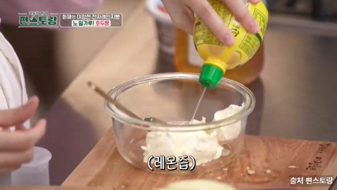 6. 호두빵이 만들어지는 동안 크림치즈 6T, 꿀1T, 레몬즙 1t, 버터 30g을 넣고 잘 섞어 레몬 크림 치즈를 만듭니다.